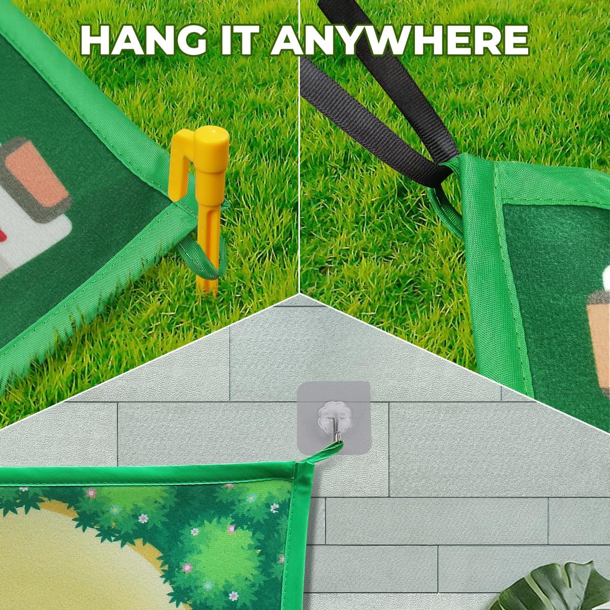 A fun game that combines darts with golf game play. The golf chipping mat can be used not only as a golf game scenario but also as a wall-mounted dart game. You can use the sticky balls or the darts to aim for the golf mat flat or hanging. And better yet! It comes with ground stakes and is even suitable for placement on grass and sand, making it easily set up anywhere outdoors or indoors.