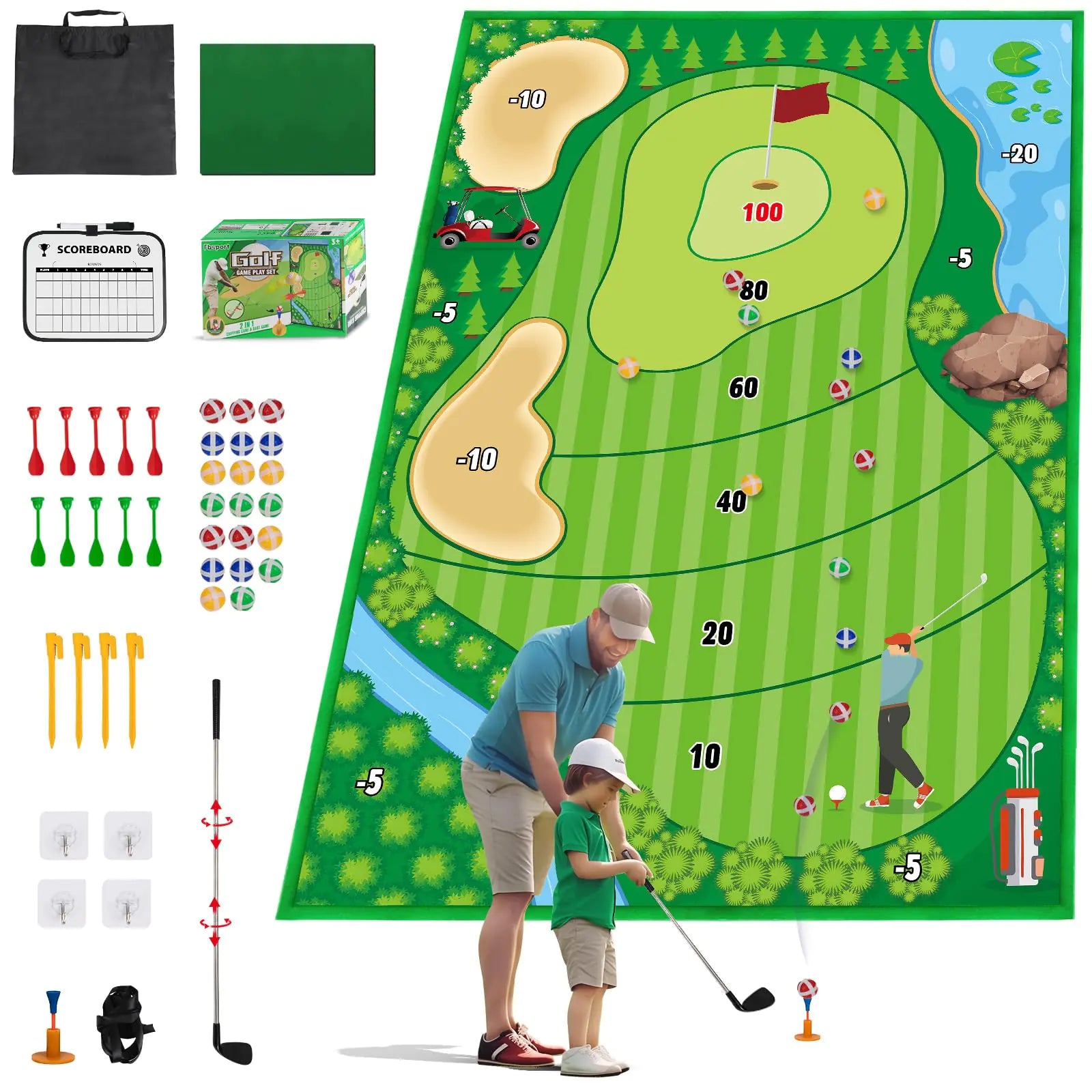 [【GOLF GAME & DART GAME】 A fun game that combines darts with golf game play. The golf chipping mat can be used not only as a golf game scenario but also as a wall-mounted dart game. You can use the sticky balls or the darts to aim for the golf mat flat or hanging. And it comes with ground stakes and is even suitable for placement on grass and sand. This golf hitting game mat is suitable for playing indoors or outdoors on a variety of surfaces. 【PLAY ANYWHERE ANYTIME】The golf training mat can be easily set up on the ground wall tree fence garage beam ball net and anywhere else with our accessories. This golf game set comes with a carrying storage bag for you to carry around. Great for traveling parties and family games. And it is suitable for single player as well as multi-player allowing you to experience multiple modes of golf games with your friends and family. 【PREMIUM QUALITY】The chipping golf mat is made of high quality fabrics and sticky. The hitting base can increase the stability when chipping. And the sticky balls are solid enough to shoot but soft and safe not to damage walls or floors with just the right amount of softness designed in. We also offer you an adjustable golf club which you can adjust the length (28.3in or 35.8in) according to your needs. 【COMPETITIVE FUN】Each player takes a turn chipping the sticky balls or throwing the darts onto the mat and marks scores on the scorecard. It will show more competitive fun to you when more players participate in. You can make your own game rules. 【NEW GOLF GAME SET】Our golf chipping game set is suitable for kids over 3 years old and adults outdoors and indoors. This set includes 1 large golf chipping mat(70.1*47.2in) 1 golf hitting mat(13.8*9.8in) 1 hitting base(random color) 1 adjustable golf club 20 sticky balls 10 darts 1 scorecard 1 storage bag 4 ground stakes 4 sticky hooks 4 ribbons. This golf game set is the perfect gift for both golf beginners and professionals.]